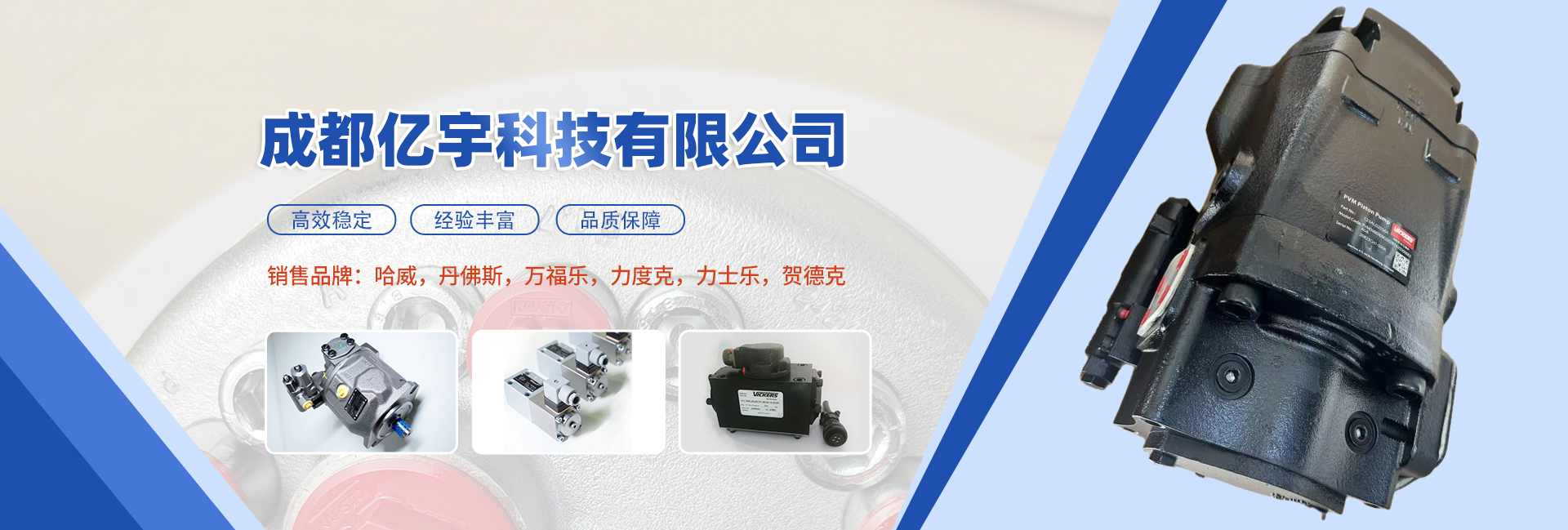 成都億宇科技有限公司是一家專業從事電子液壓產品銷售及成套液壓系統設計制造的高科技企業。 主導產品:液壓系統、潤滑系統、電控系統、液壓缸,泵,閥,油缸,馬達,接頭,管件,傳感器,蓄能器,繼電器,密封圈等。同時擁有熟悉國內外液壓機電產品的專業人員為您解決機械液壓方面的問題,并匯集了一批在流體傳動領域內具有豐富實踐經驗的專業技術人才,致力于各種高品質液壓產品及系統的研制工作。經過我們不懈的努力發展和創新,已與眾多國內外供應商建立了良好的合作關系,在價格及供貨周期上均有較